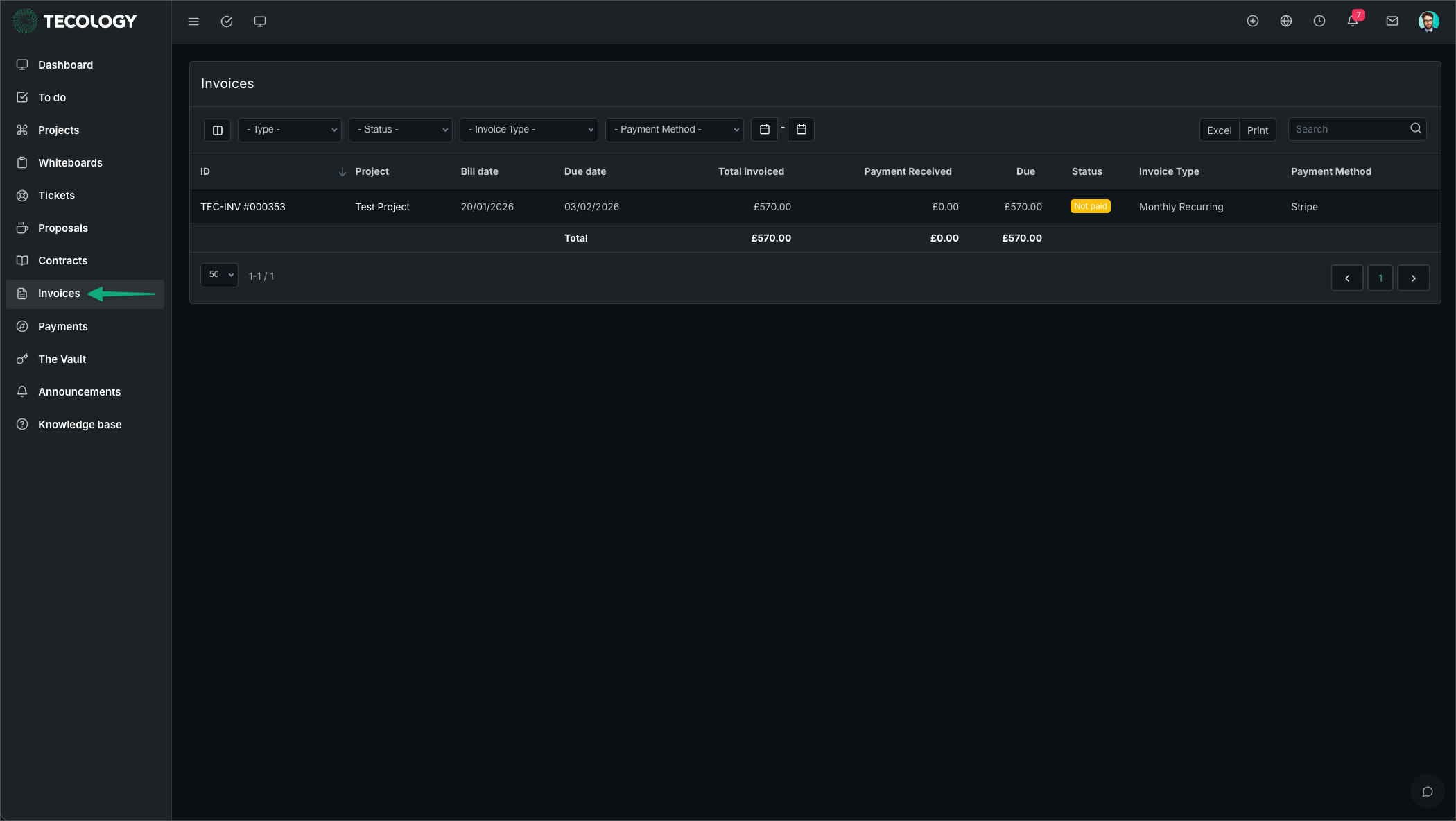 All invoices issued by Tecology are available directly within Tecology Workspace. This allows you to view, track, and download your invoices at any time without needing to search through emails or contact support.