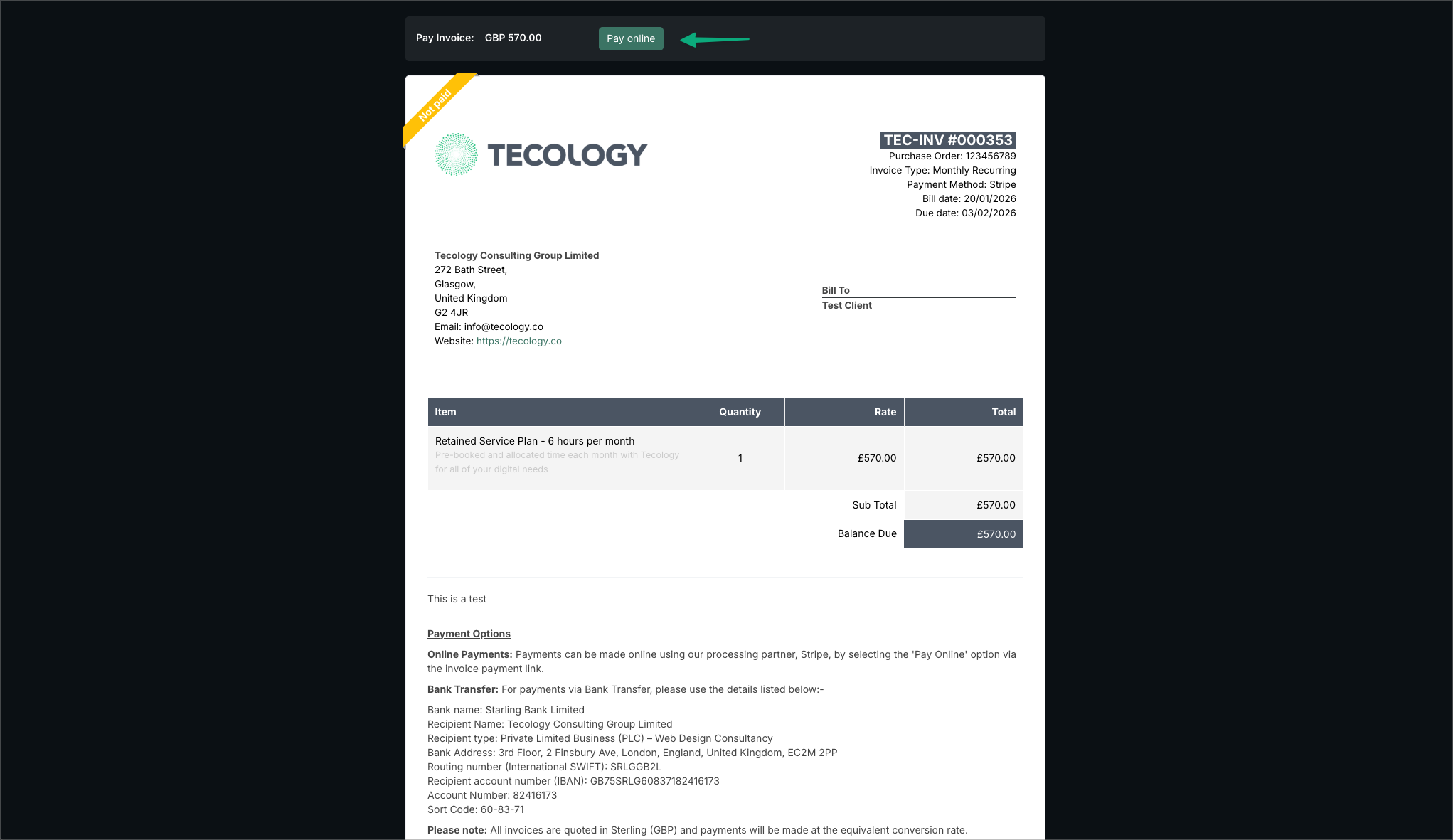 Invoices can be paid without signing in to Tecology Workspace. This is particularly useful for finance teams or accounts departments who only need to process payment.