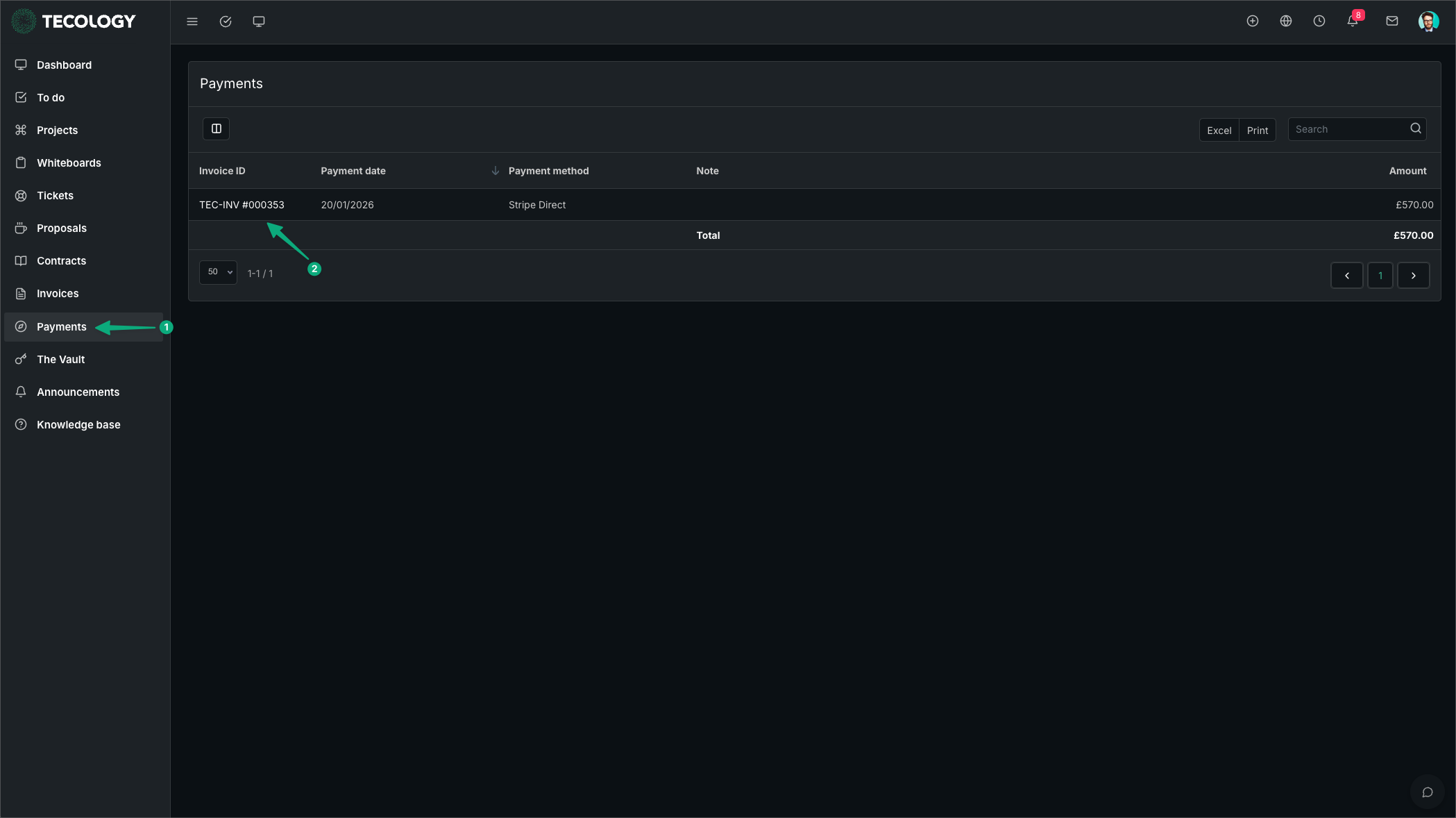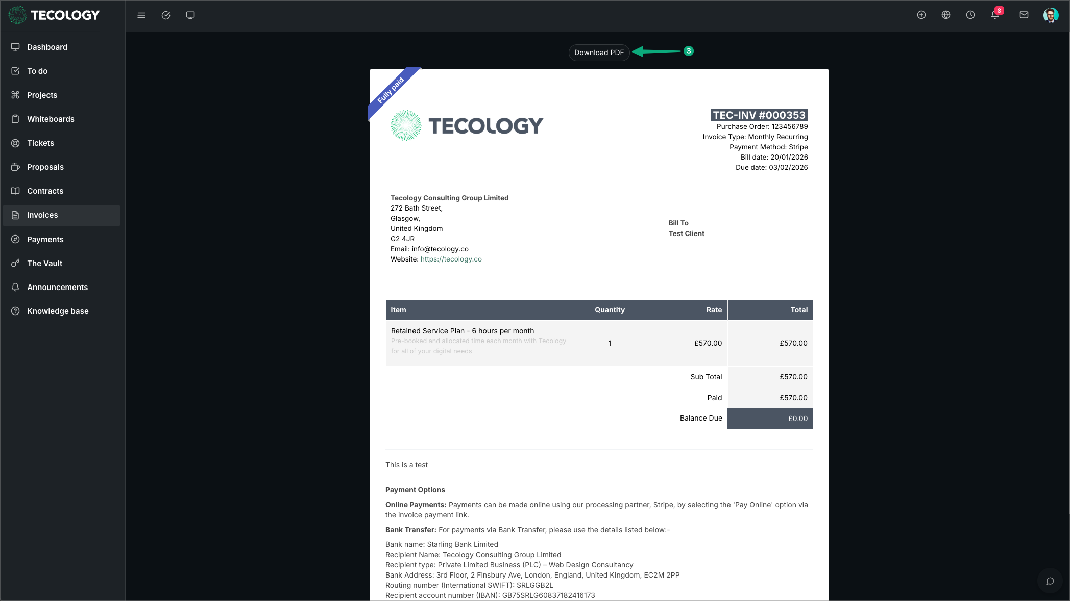 Receipts for paid invoices are available directly through Tecology Workspace and can also be accessed from invoice emails. This allows you to retrieve proof of payment whenever it is needed for accounting or record-keeping purposes.