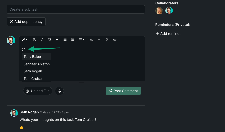 As you type, a list of people associated with the project will appear. For example, typing @Tom Cruise will notify Tom and draw attention to that comment.