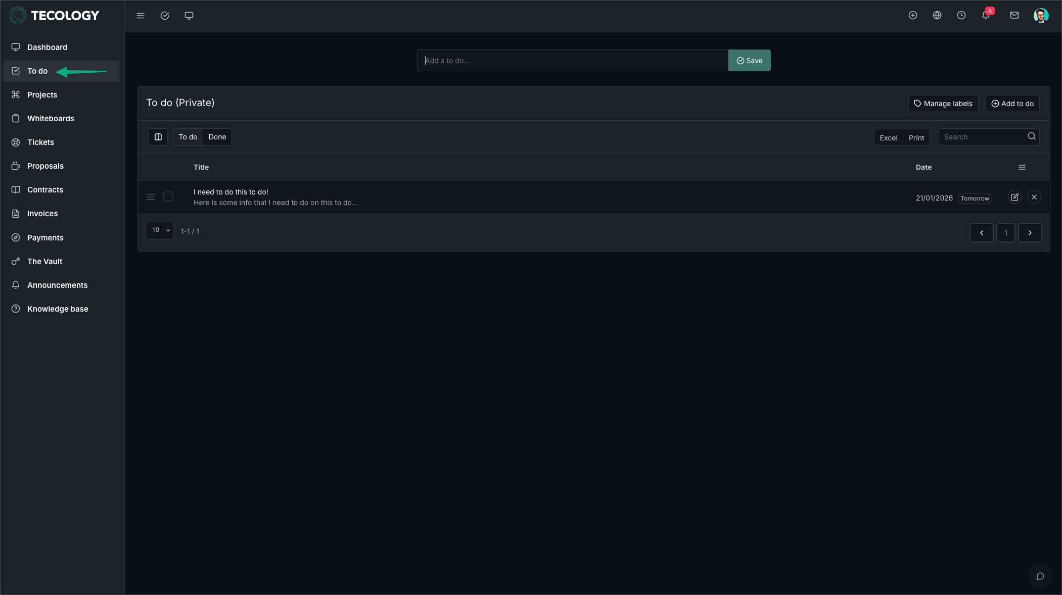 Tecology Workspace includes a simple personal To-Do list to help you keep track of your own reminders while working with Tecology.