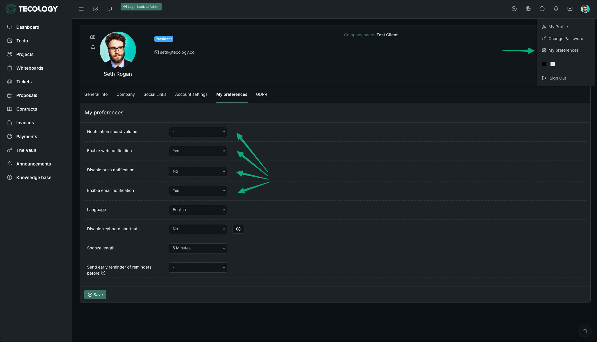 From your profile menu, select My preferences to review options such as email notifications and in-platform alerts. These settings allow you to choose how you’re notified, but they do not affect what activity is recorded in the system.